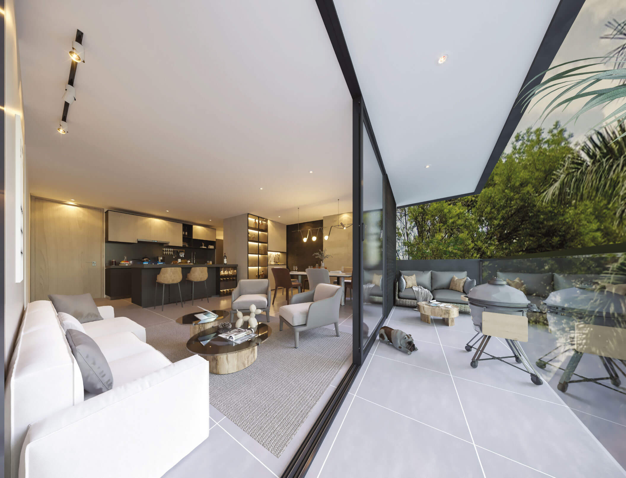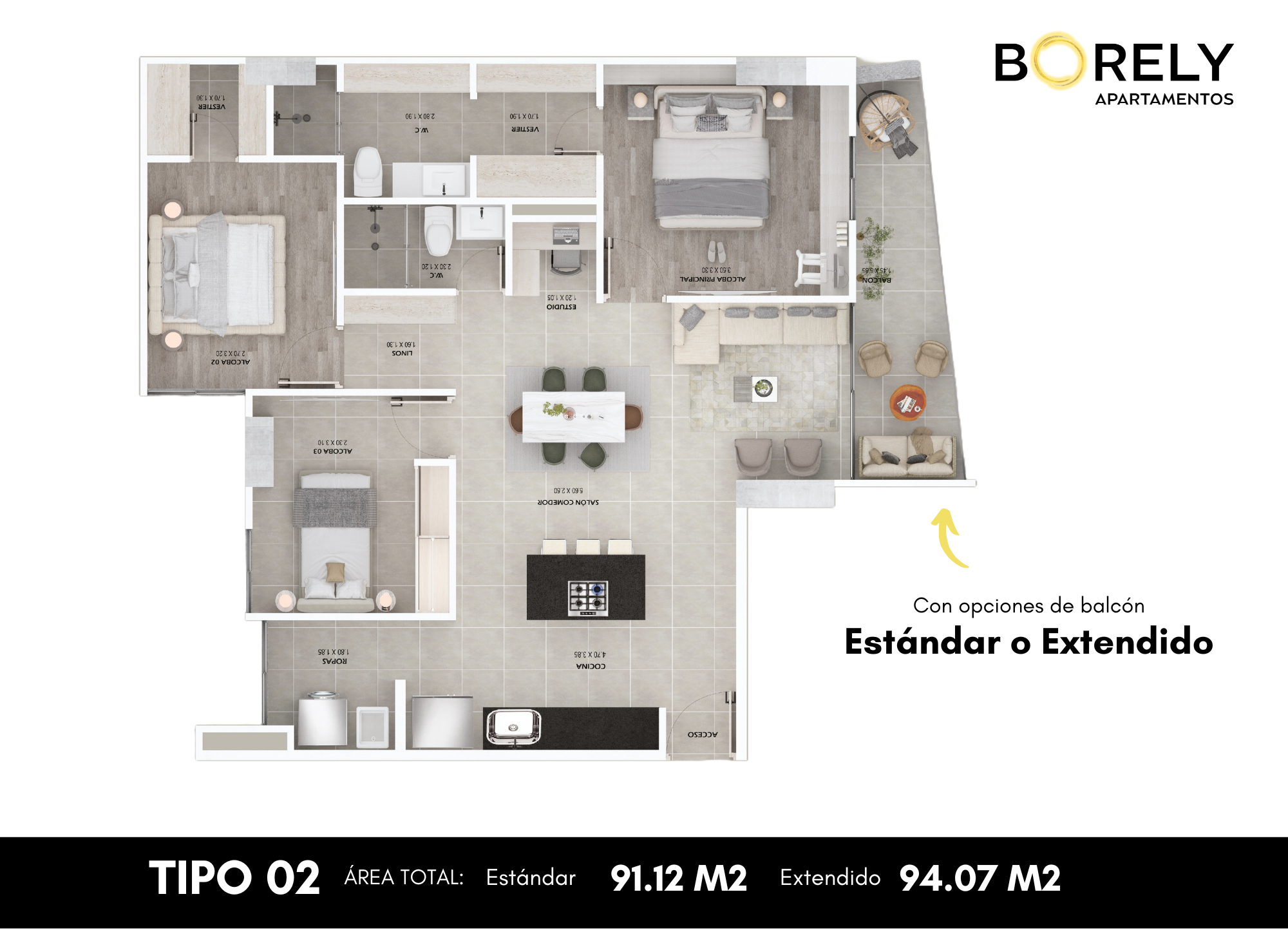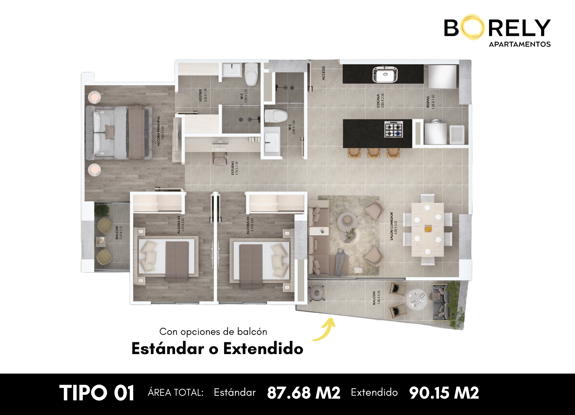 Apartamentos totalmente terminados con 3 alcobas + estudio, 2 balcones y más… En un diseño vanguardista, sobrio y a la vez elegante.