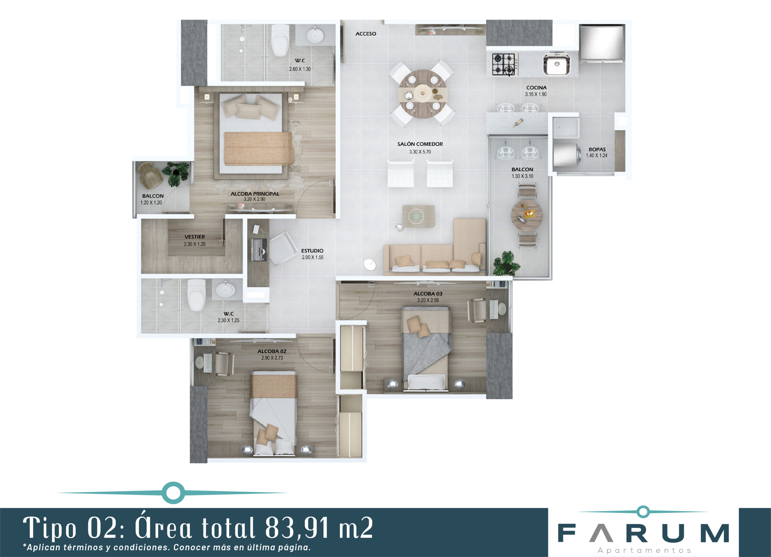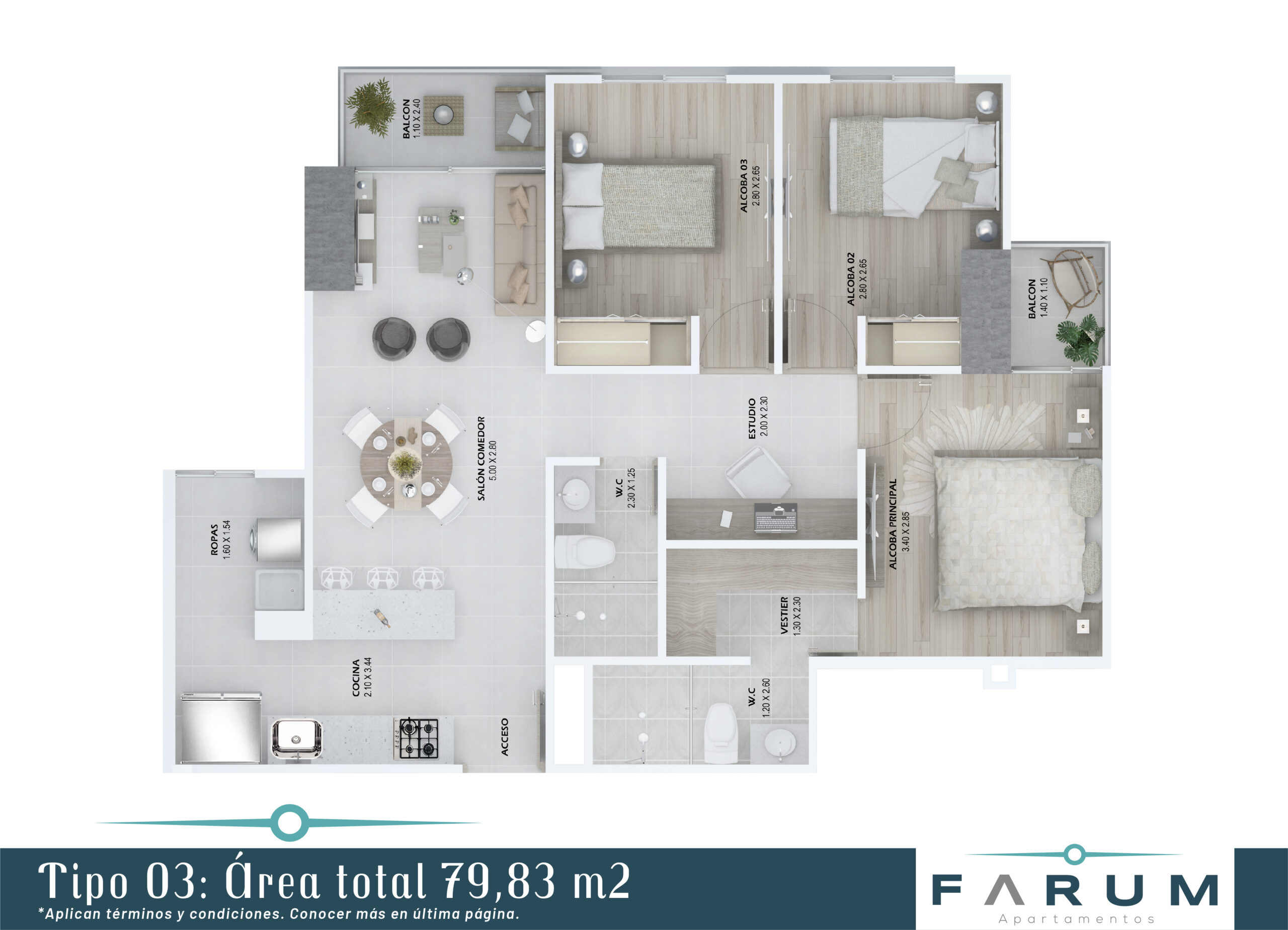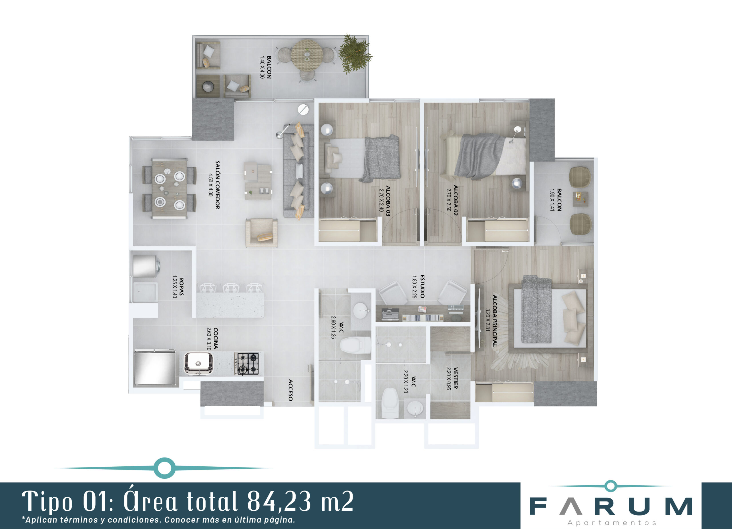 Apartamentos totalmente terminados con 3 alcobas + estudio, 2 balcones y más… En un diseño vanguardista, sobrio y a la vez elegante.